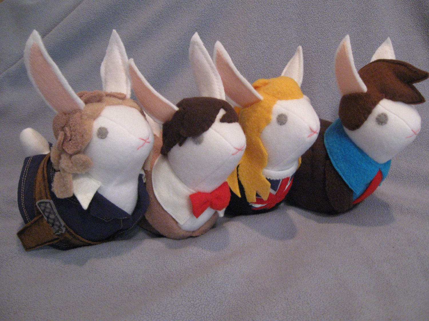 These bunnies are pleased to just laze about all day.. in a bowl, in a window, or atop some cozy pillows. Half bean, half bunny, these little critters can't hop out on you for the holiday, so invite one over! The bunnies are about 6" tall, not counting the ears, and are made of prewashed materials. Each sold separately.Each character is priced at $15, expect for the Fourth and Sixth Doctors, which are $18 each. They are also available in 10" versions, which will run $21 a piece, plus shipping and handling. If there are any Doctors, companions or other fantasy characters not listed on her store, Catherine is more than willing to take requests.